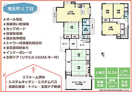 広々とした土地約134以上の6LDK。インナーガレージ・屋外駐車場スペース付き。