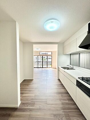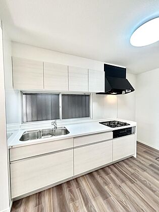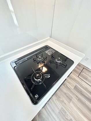 【リフォーム済】新品交換したキッチンは3口コンロで同時調理が可能。大きなお鍋を置いても困らない広さです。お手入れ簡単なコンロなのでうっかり吹きこぼしてもお掃除ラクラクです。