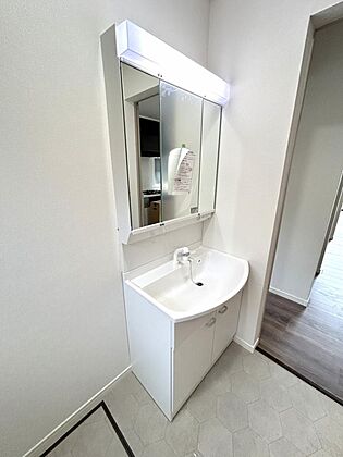 【リフォーム済】洗面化粧台はパナソニックAWE社製の新品に交換しました。大型の洗面ボウルは洗顔・洗髪ももちろん、つけ置き洗いにも使えます。