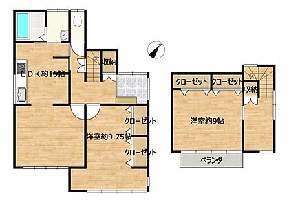 【リフォーム済】間取りは2LDKの二階建てです。緑豊かなエリアにございます。コンパクトな間取りですが、各居室の畳数が大きいためゆったりと暮らせます。