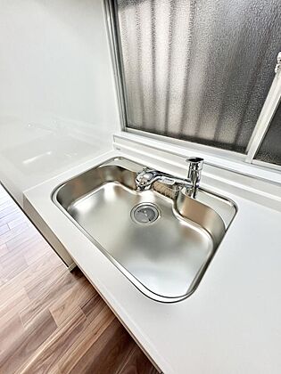 【リフォーム済】新品交換したキッチンのシンクはサビにくく熱に強いステンレス製です。水はねの音を抑える静音設計で、従来よりもさらに水音が静かになっています。