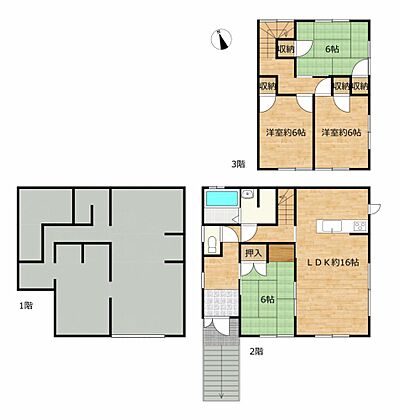 【間取り図】高床式の3階建の住宅です。趣味の多い方でも安心の収納力です。