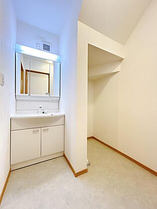 【リフォーム済】洗面化粧台は三面鏡タイプを採用しました。朝の支度がしやすく、見た目もすっきりします。