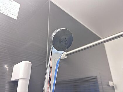 【リフォーム完成】新品のシャワーヘッド。シャワーヘッド中央は渦を発生させ一気に散水する旋回流のeシャワー、外周はストレートシャワー。二種類のシャワーの組み合わせで、節水と浴び心地のよさを実現。