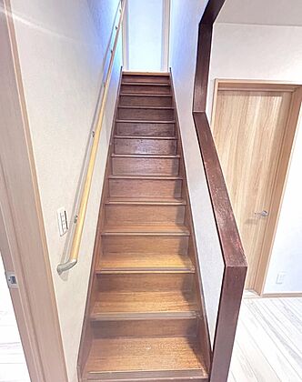 【年内入居可】【耐震工事実施】【リフォーム完成】階段写真。階段はクリーニング後に塗装致しました。手摺の交換と滑り止めも新設しております。
