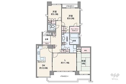 間取りは専有面積113.98平米の3LDK。LDK約23.7帖のプラン。バルコニー面積は12.68平米です。