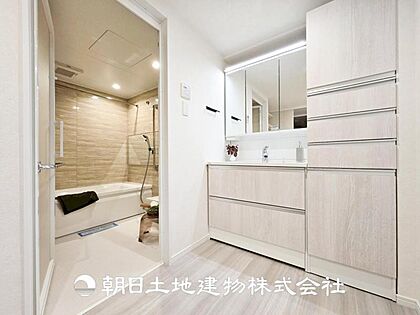 【浴室】上品な色合いが魅力のバスルームは、ほっと落ち着く空間を作り出しています。広々とした浴槽で体を癒やしながら、疲れを取り除けるような仕様です。お子様と一緒に楽しく入るのもいいですね。
