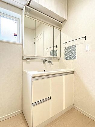 三面鏡付きの洗面台です。鏡裏にも収納可能。