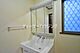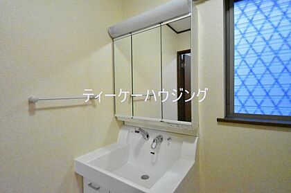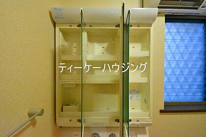 三面鏡の裏には収納がたっぷり。洗面室をすっきりきれいに使えます。