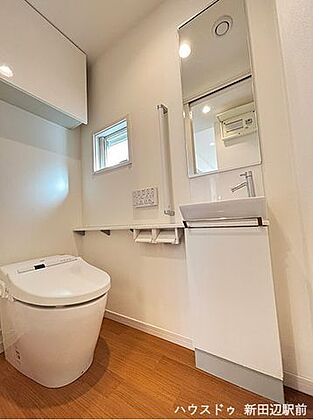 トイレには手洗いカウンターを設置。タオルやお掃除グッズなどの収納力もUPします。お子様にも使いやすいですよ。