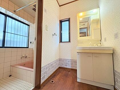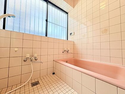 温かみのあるピンクのタイル張りの浴室。浴室乾燥機完備です。