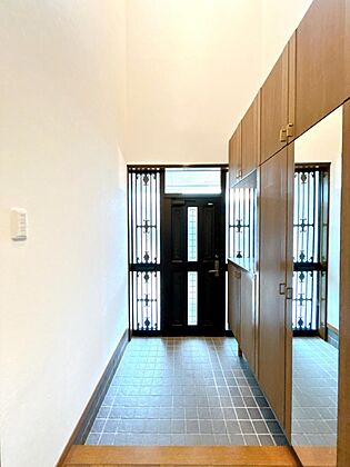 【リフォーム済】玄関内部写真です。鏡付きのシューズボックスがございます。壁・天井クロス張替え、照明交換を行いました。