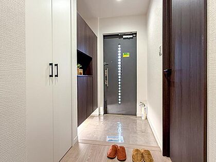 上質感漂う玄関と廊下。居住者の帰り・訪れる方を優しく迎える、安らぎに満ちた生活空間を予感させます。