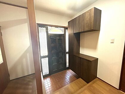 (リフォーム済)玄関ホールです。天井と壁はクロス張りにし、床はフロアタイルの重ね張りをし、シューズボックスは新品に交換しました。
