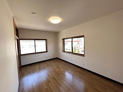 (リフォーム済)2階洋室約7.5帖です。天井と壁のクロス張りをし、床はクッションフロアの重ね張りをしました。2面採光の明るいお部屋です。
