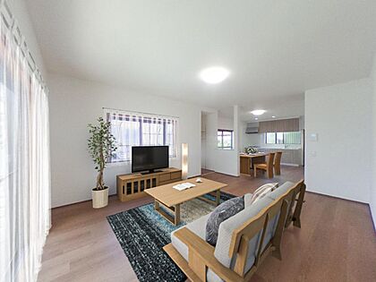 (リフォーム済)別角度から見たLDKです。約20帖の広々とした空間に仕上げました。ダイニングテーブルとソファーがゆったりとおけるスペースです。