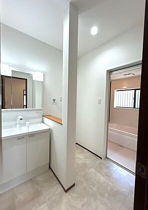 (リフォーム済)洗面台は三面鏡付きを新設しました。鏡裏に収納スペースがあります。扉を閉じると三枚の鏡がフラットになりますので大きな一面鏡としても使えますよ。