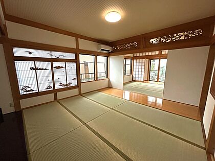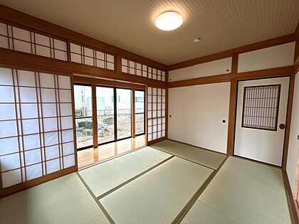 (リフォーム済)1階和室南側6畳です。天井壁はクロス張りにし、畳の表替えをしました。広縁からは庭に出入りできます。