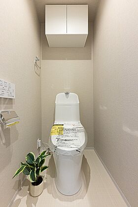 掃除用具等の収納に便利な吊戸棚を設置。温水洗浄機能付きの便座で快適で清潔な使用感を得られるトイレ