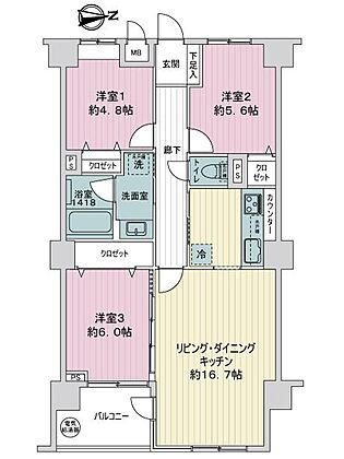 約3.8平米のバルコニー。リビングと洋室3から出入が可能
