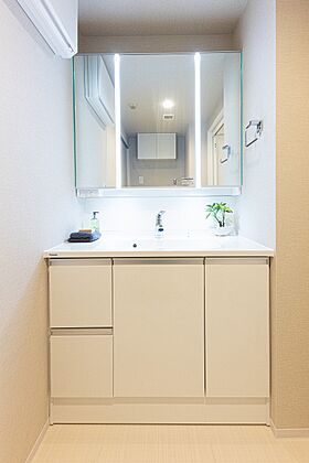 お手入れのしやすいボウル一体型を採用。洗面台下や三面鏡裏には収納スペースあり