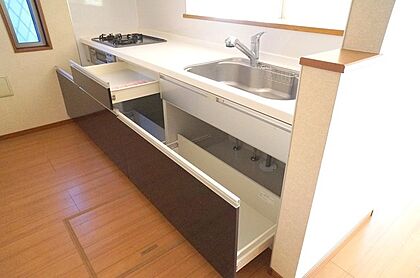 収納スライドをぐっと開けばお鍋や調味料をどんどんしまえる大収納。キッチンはいつもキレイ。