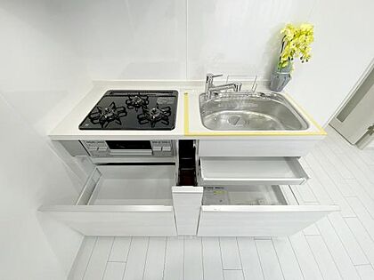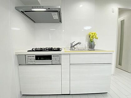 ガス3口のシステムキッチンです。スリムタイプのレンジフードのため、お手入れが簡単