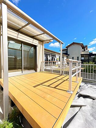 【東側ウッドデッキ】洋室2から続くウッドデッキです。陽当たり良好です。