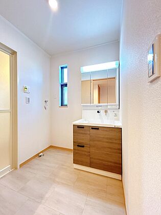 【リフォーム済み/洗面化粧台】洗面化粧台はハウステック製の新品に交換しました。三面鏡の裏側はすべて収納になっています。洗面ボウルは底が平らなので、つけ置き洗いなどの家事でも活躍します。