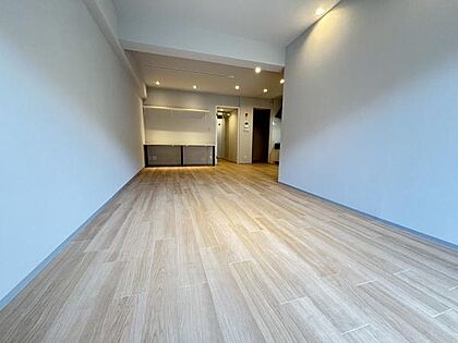 広々としたリビングには落ち着いた雰囲気が広がります。照明が効果的に配置されており明るさをしっかりと確保しています。床材は木目調で温かみのある印象を与えます。