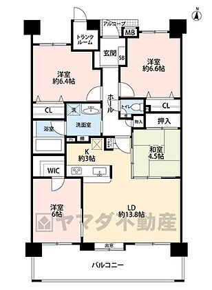 リビングは16.8帖の開放感あふれる空間です。全洋室も6帖以上と広々^^バルコニーは2部屋より出られて便利です。