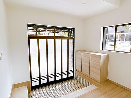 【リフォーム済】玄関ホールです。壁、天井クロスを交換し床をフローリングで仕上げました。ステップがあるので上り下りしやすいですよ。