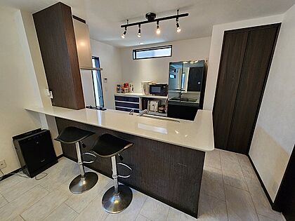 ハイオープンのカウンターキッチン 家具と重ならない採光用の窓・パントリー・奥行きのあるカウンターが特長です