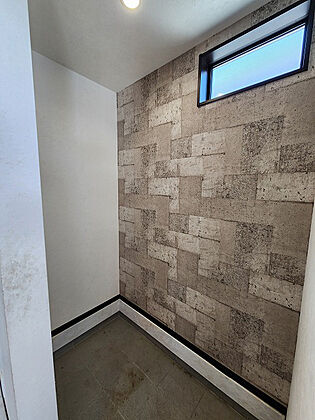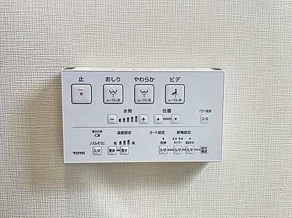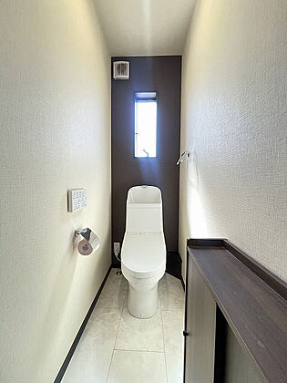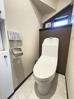 壁付の収納棚とトイレのリモコンは、空間をスッキリさせてくれます。