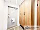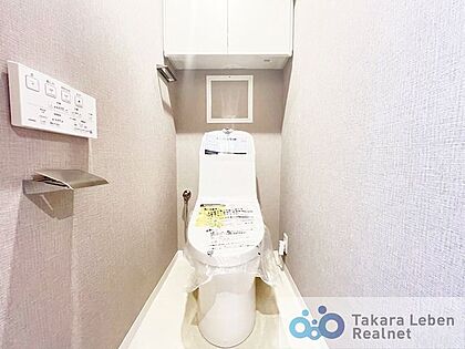 白を基調とした清潔感のあるトイレ。上部に収納もついておりますので、とても便利です。