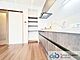 洗面スペースには防水パン付きの洗濯機置場があります。上部の棚は洗剤やタオルなどの収納に便利。