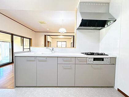 【リフォーム済】約20帖以上のリビングです。キッチンは広々としており人気の対面キッチンです。キッチンの新品交換、クロスの交換工事を行いました。