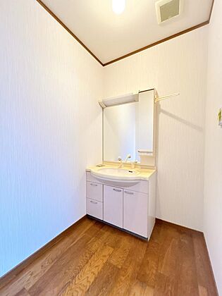 【リフォーム済】洗面化粧台です。クロスの新品交換を行いました。ハウスクリーニングを行いお引渡しさせていただきます。