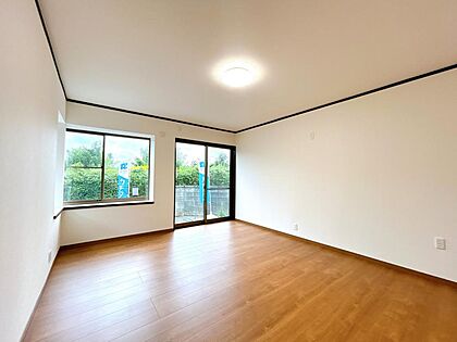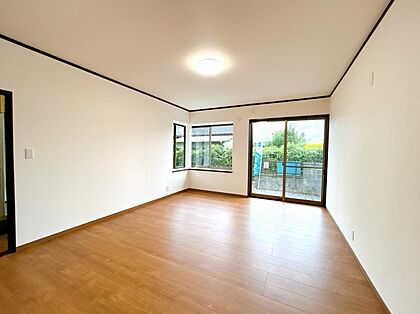 【リフォーム完成】リビングの別角度写真です。南側に掃き出し窓と広々とした出窓があるため、日当たりが良く明るいお家です。