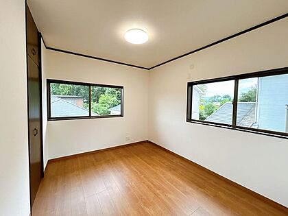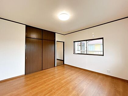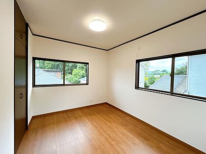 【リフォーム完成】2階南西側洋室の写真です。床はフローリング重ね張り、壁と天井はクロス張替を行いました。8帖の居室で主寝室でも使えますね。