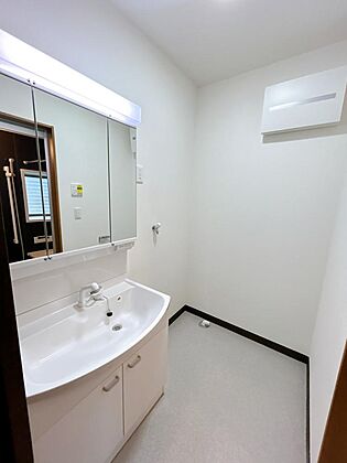 【リフォーム完成】洗面化粧台はパナソニック製の新品に交換。三面鏡の裏側はすべて収納になっています。洗面ボウルは底が平らなので、つけ置き洗いなどの家事でも活躍します。
