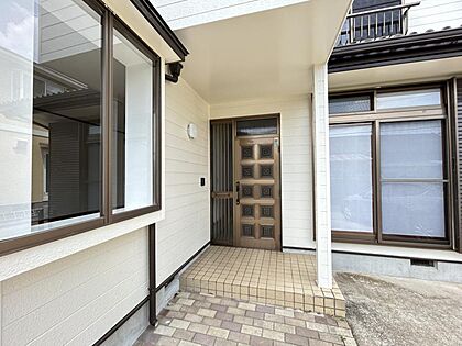 【リフォーム完成】玄関の写真です。玄関扉は洗浄と鍵交換、タイルは洗浄を行いました。テレビ付きモニターインターホンを設置済みのため、来客時も安心ですね。