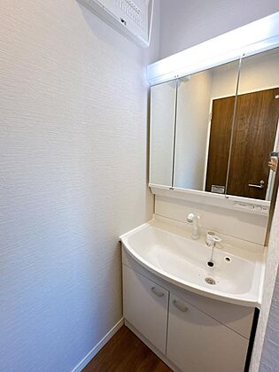 【洗面所】洗面化粧台は三面鏡タイプを採用しました。朝の支度がしやすく、見た目もすっきりします。