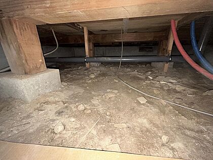 【床下】中古住宅の3大リスクである、雨漏り、主要構造部分の欠陥や腐食、給排水管の漏水や故障を2年間保証します。その前提で床下まで確認の上でリフォームし、シロアリの被害調査と防除工事もおこないます。