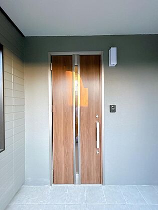【リフォーム済】玄関の内部はタイル張替えや照明新品交換、クロスの張替えを行いました。おうちの中と外をつなぐ玄関だからこそきれいに仕上げました。
