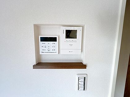 【ドアホン】カラーモニター付きのドアホンです。リビングに設置のモニターで玄関にいらしたお客様を確認してから応対できます。留守中の来客も記録できるので防犯面でも安心ですね。
