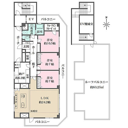 最上階、3面バルコニー&屋上ルーフバルコニー付きのプレミア住戸。各水回りにも窓があり通風良好です。
