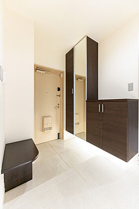 姿見付きのフロートタイプのシューズボックスがございます。靴の脱ぎ履きに便利な腰掛も設けられています。【玄関】