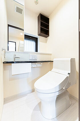 温水洗浄便座付きのトイレです。手洗いカウンターや鏡・吊り戸棚が備わった、使い勝手の良い仕様です。【トイレ】