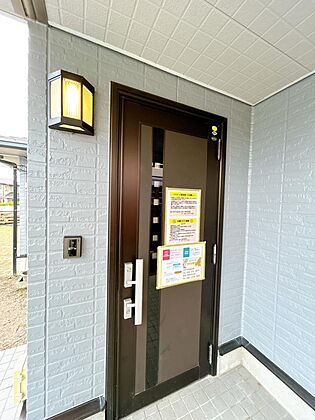 •  【リフォーム済】玄関ドアは鍵交換を行いました。ポーチ部分の照明を新品交換しましたので、お客様を迎える玄関廻りは、明るくスッキリとした印象に仕上がりました。
